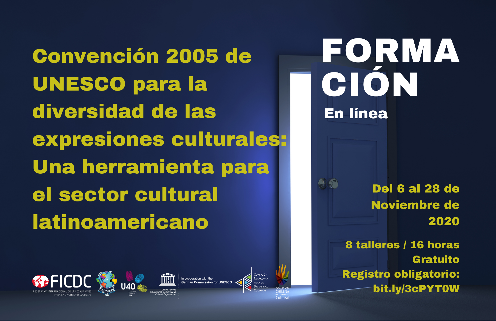 El diseño (©todos los derechos reservados) y operación de este curso fue comisionado a nuestra organización durante 2020, año del 15 aniversario de la Convención de 2005, por la Federación Internacional de Coaliciones para la Diversidad Cultural y la Comisión Alemana para la UNESCO. Este diseño fue la base sobre la que se elaboró el «Seminario Internacional: Convención de 2005, hoja de ruta para las políticas culturales“ del Ministerio de las Culturas, las Artes y el Patrimonio del Gobierno de Chile. Un ejemplo que pone en evidencia las sinergias entre Sociedad Civil y Estados Parte de la Convención de 2005